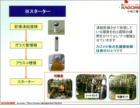 資料1のスターターというのは、粉状の凍結菌株をまず試験管で増やし、それをフラスコで増殖させてタンクで培養します。約2週間の期間をかけて少しずつ増殖させていくんですよ(資料2)。