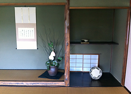 十三夜の設定とのことで、明治日本の元勲、高貴な西園寺公望氏の時代考証のからむ生活者視点が必要でしたので、学芸員の方に、当時の背景などもおうかがいしたうえでの室礼(しつらい)を提案。翁がほろ酔い気分で、「十三夜に曇りなし」の昔からの言葉どおりの輝く月を愉しむシーン。床の間に一晩だけ大輪の花を咲かせる月下美人を活けました。それまでにない緊張感に包まれた仕事の一つでした。