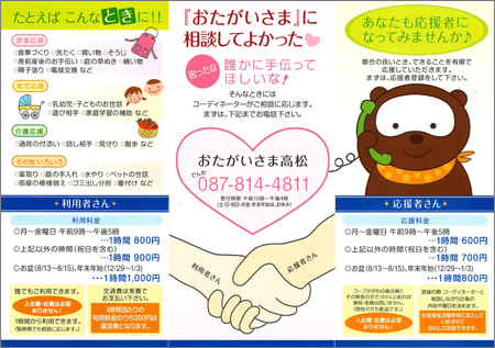 でもいまは、ご近所とのおつきあいが少なくなってきて、助けてもらえる人が身近にいないことが多いかと。とくに高松は転勤族が多く、子育て中の若いお母さんが、「誰かの手を借りたいのですけれども、知り合いがいませんので」と電話をかけてこられたりします。