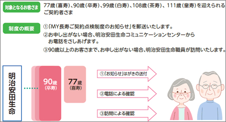 その一つに、「MY長寿ご契約点検制度」という、長寿の節目年齢にあたる77歳(喜寿)、90歳(卒寿)、99歳(白寿)、108歳(茶寿)、111歳(皇寿)を迎えられた個人保険にご加入のすべてのご契約者に、保険金等のご請求の有無(請求確認)と、ご住所等の連絡先の確認を行う制度があります。