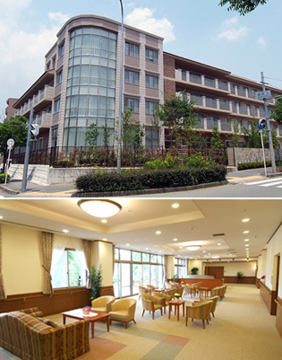 介護付有料老人ホーム「アクティブライフ豊中」の外観と1階にあるサロン