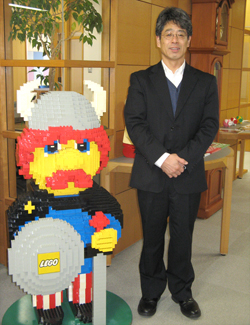 広島オフィス受付にて、デンマーク・レゴ社のブロックで作られたバイキングとともに。