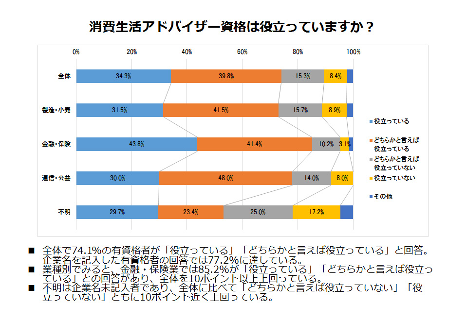 消費生活アドバイザー資格者へのアンケート調査結果を見ると、残念ながら、資格が「どちらかといえば役立っていない」また「役立っていない」とお答えになった方が、全体の24%ほどを占めています。