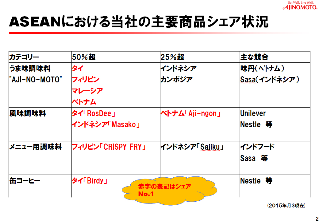 その結果、現在、アセアン諸国での味の素グループの商品は下図のような位置づけとなっています。