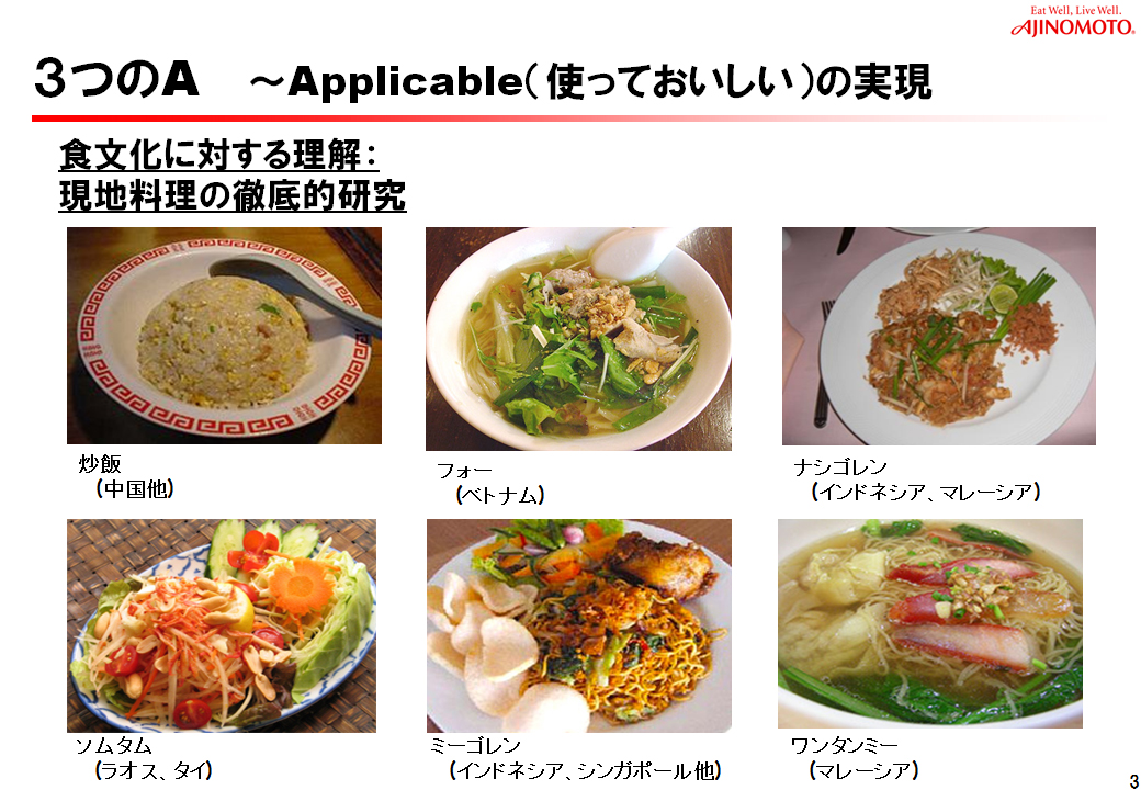 たとえば日本でほんだしを伝えようと思ったら、味噌汁でお伝えするわけですが、こうしたことをベトナムではフォーで、マレーシアやインドネシアではナシゴレンといったようなメニューで行います。