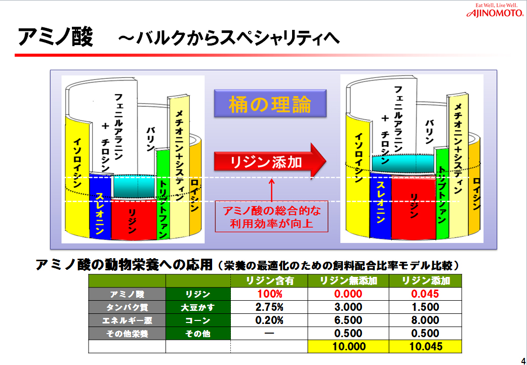 したがって、他のアミノ酸をより有効に使うには、この不足しているリジンを右のように追加します。すると、他のアミノ酸もそれだけ有効に使われます。