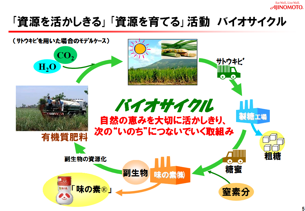 たとえばサトウキビ。粗糖をとった後の糖蜜から発酵技術でグルタミン酸をとります。残った液をそのまま捨てれば、川は汚れてしまいますが、ここにも養分が豊富に含まれています。これを肥料化して、サトウキビ畑に戻す。これでサイクルが完結するわけです。当然、この肥料によってサトウキビは、よりよく育ちます。