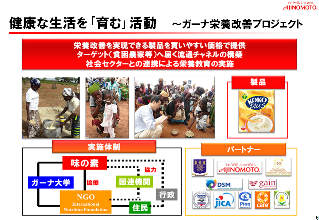 ガーナではトウモロコシを発酵させてできたおかゆ(ココ)を使って離乳をしています。しかし、ココだけで離乳をしますと、アミノ酸が足りなくなります。そうすると、先ほどの桶の理論のように、ほかの栄養素も身体は吸収できなくなります。そこで味の素グループは、必要なアミノ酸をいくつかとビタミンをココに加える「ココプラス」という商品をつくりました。