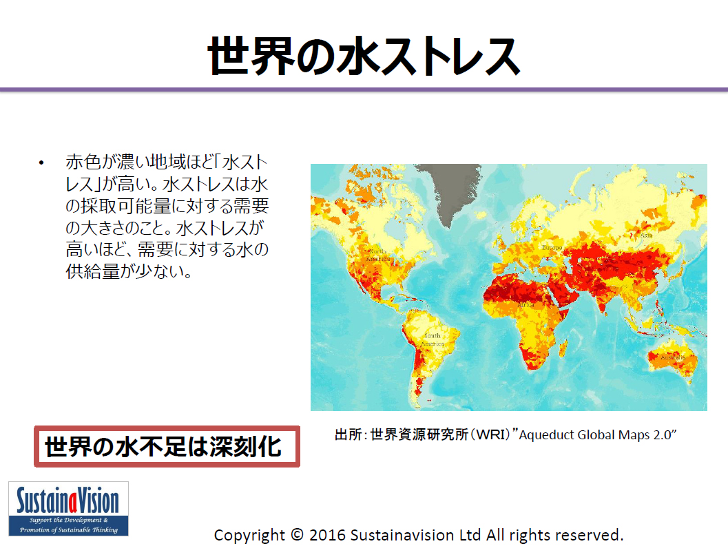 下図の赤い部分は、世界における水ストレスが高い地域です。水不足がたいへん深刻な状況であることがわかります。
