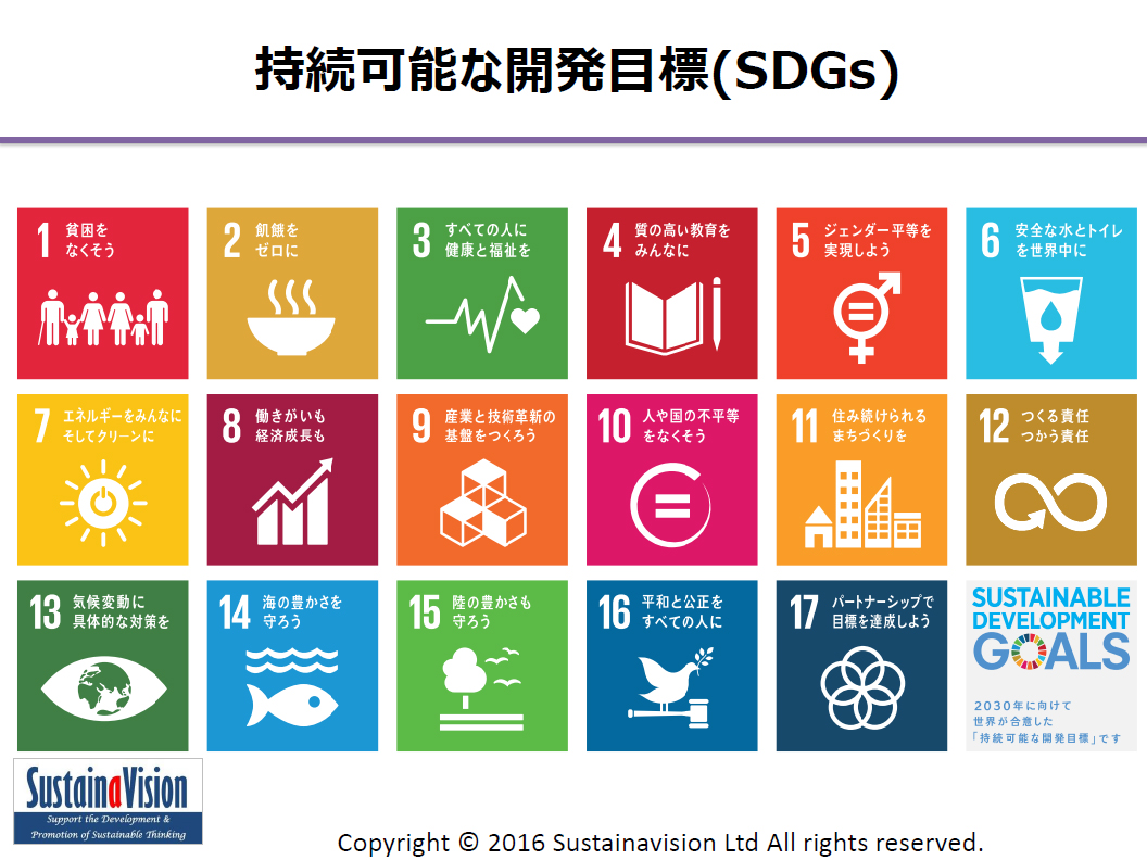 2015年9月、国連で持続可能な開発目標(SDGs:Sustainable Development Goals)が採択されました。この年に期限切れとなる国連ミレニアム開発目標を継承・発展させたもので、発展途上国・新興国のみならず、先進国も含むすべての国が17の分野別の目標と、169項目の達成基準を推進していくことになっています。