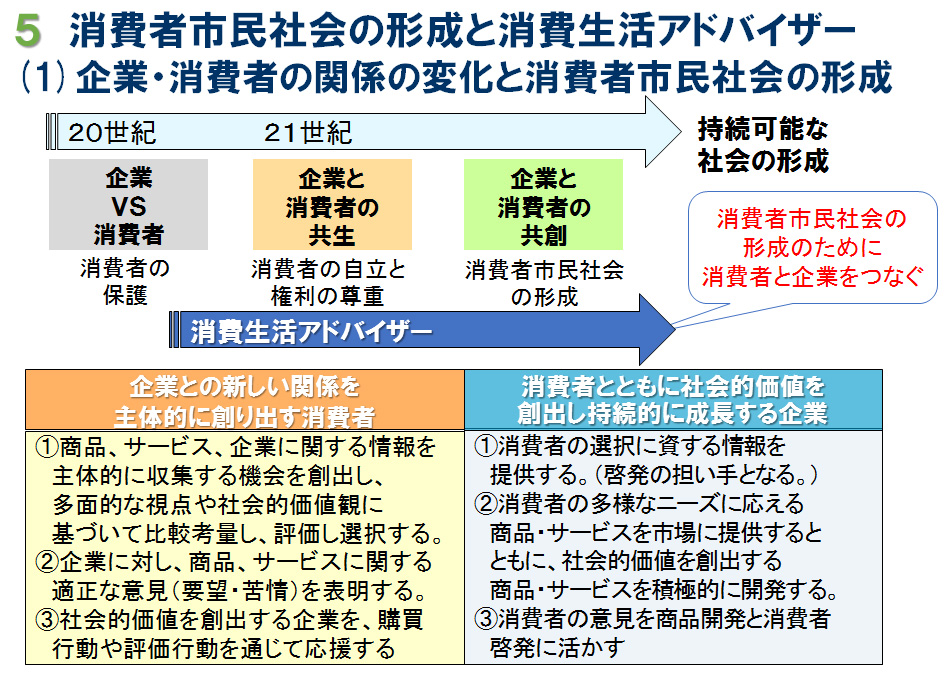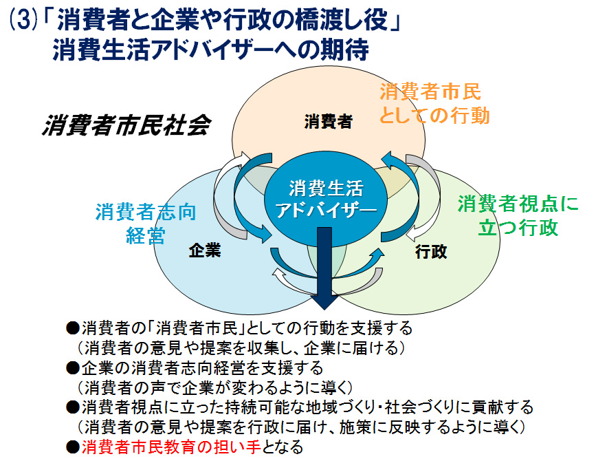 消費者市民としての消費者、消費者志向経営の企業、消費者視点に立つ行政、この3つをつないでいく役割です。その内容が、まさに消費者市民教育の担い手というところに結びついていくと思います。