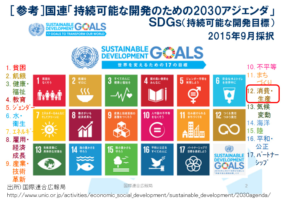 国連でも持続可能な生産と消費が、2030年のアジェンダの大きなテーマになっています。最後に、参考として、2015年9月に採択された国連「持続可能な開発のための2030アジェンダ」SDGs(持続可能な開発目標)をご紹介いたします。