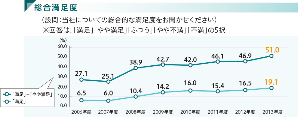 「お客さまの声」統括部を設置した翌年、2006年度は「満足」と「やや満足」の合計が、27.1%だった。それが2013年度には2倍近くの51.0%へと上がっている。